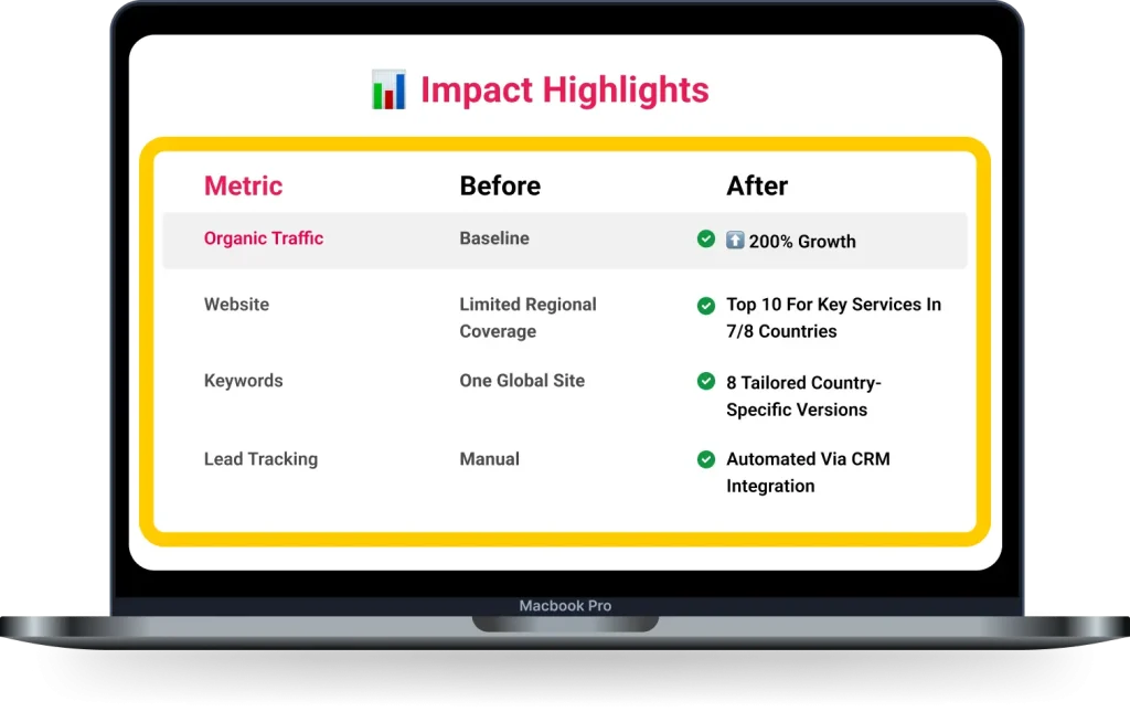 We conducted in-depth search behaviour mapping across all 8 countries, identifying high-intent keywords per market. This laid the groundwork for localized SEO content plans with measurable ROI.